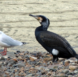 January 18, 2021: I thought I was seeing a different species of cormorant or an old one or young one or a partially leucistic one. I didn't really know for sure. I had been out for a walk and saw a couple cormorants with white on them, and I was so excited. I had been recovering from an ankle injury, and it was my first real walk to see if I was ready yet to go longer distances, so I chanced a shorter walk than usual. It ended up being a bit longer than intended because I came back to my flat to grab my camera and go out again. By the time I got back, most of the 20 or so cormorants hanging out there had already left. Just my luck! I figured it was hopeless, but then I saw that the 2 cormorants left both had the white on them! I couldn't believe it! I thought it was an anomaly. But when I came back home, ankle intact and all, thankfully, I did some research to see what they might be, and it turns out they are the same cormorants but in breeding plumage. I didn't know that they have breeding plumage. I've never seen cormorants at home develop them, but I also only know of one place to see them in my city, and I don't go there often, so perhaps they do this, and I've never seen it before. Even though it wasn't a new species, it was still exciting to be able to see this change in their plumage. Back home, we don't really start seeing and feeling spring weather until late March or early April, and that when migrating birds start venturing back, but I imagine since the weather is milder here, I'll see breeding happen sooner and birds starting to turn around now and in the near future. For now, here are some of the breeding plumage photos. I think you can click on them to see the whole photo as they get a bit cut off here. You might recognise the black-headed gull in the photos as well, and I've noticed some of them are starting to develop their breeding plumage as well, but I'll share those in their entry later.